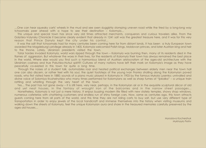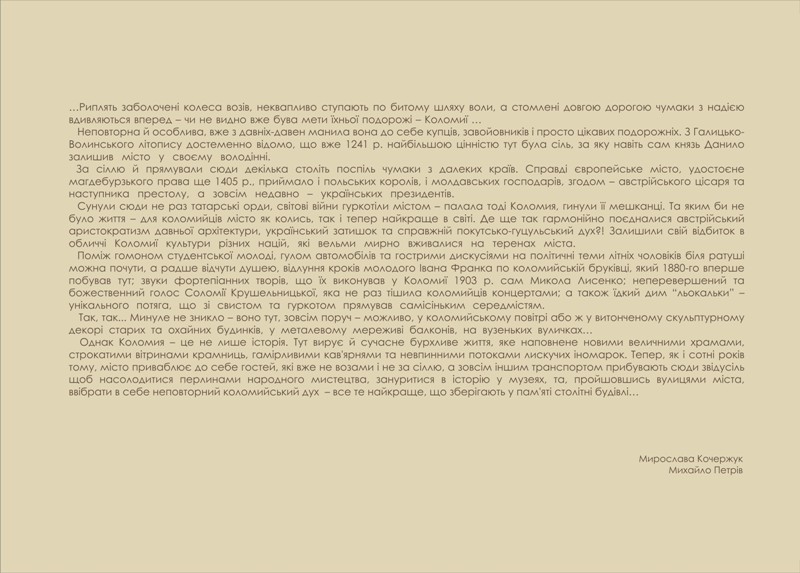 Відкриваючи мальовничий альбом, перше, що кидається нам у вічі, це сердешне звернення до коломийців та гостей міста міського голови п.Ігоря Слюзаря та голови Коломийської райдержадміністрації п.Михайла Негрича. У передмові Мирослави Кочержук та Михайла Петріва оживає дух старовинної архітектури Коломиї та передається ідея видання альбому.