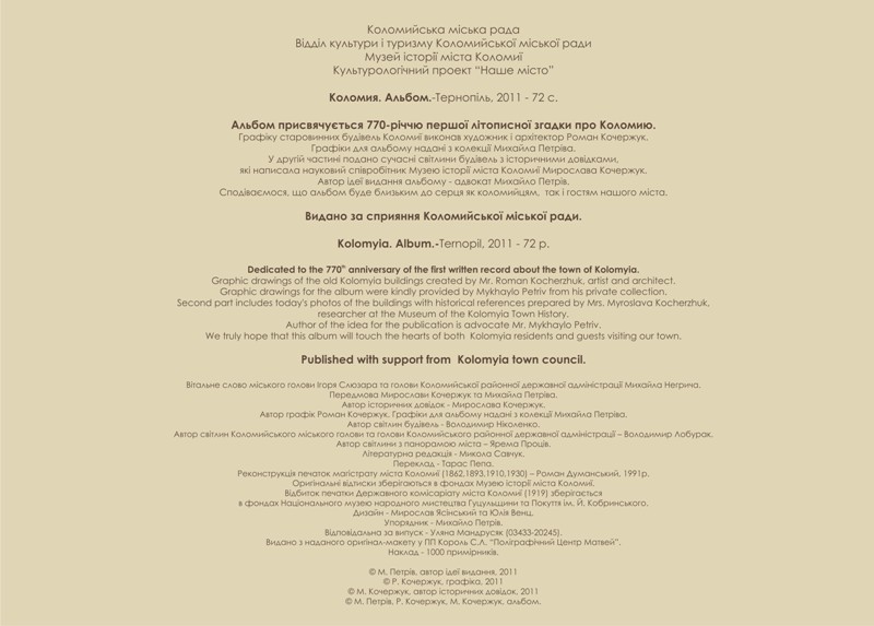 Альбом так і залишився би ідеєю, якби не було підтримки нашої ініціативи та діяльної участі начальника відділу культури та туризму Коломийської міської ради п.Уляни Мандрусяк та директора Музею історії міста Коломиї п.Михайла Арсака за що усім їм шаноблива подяка.