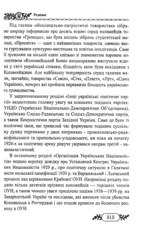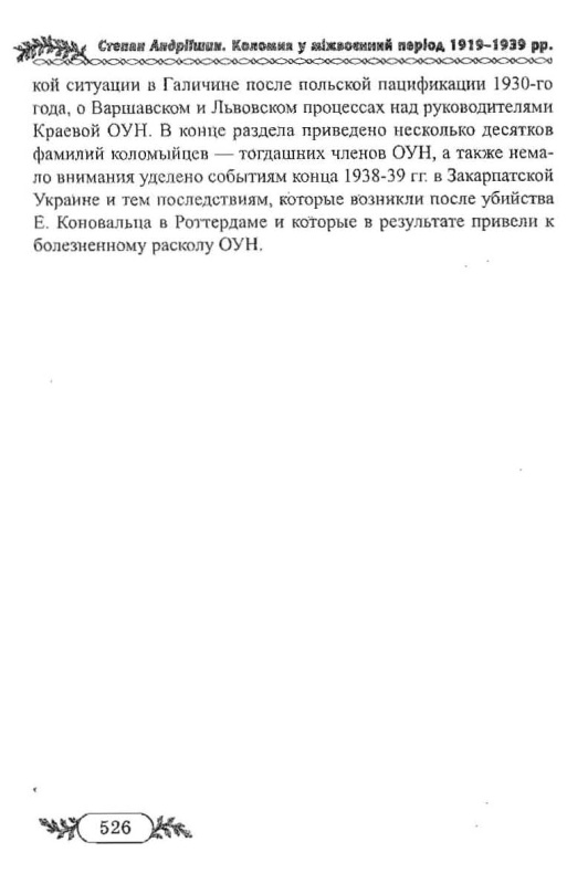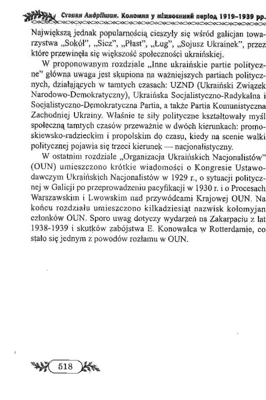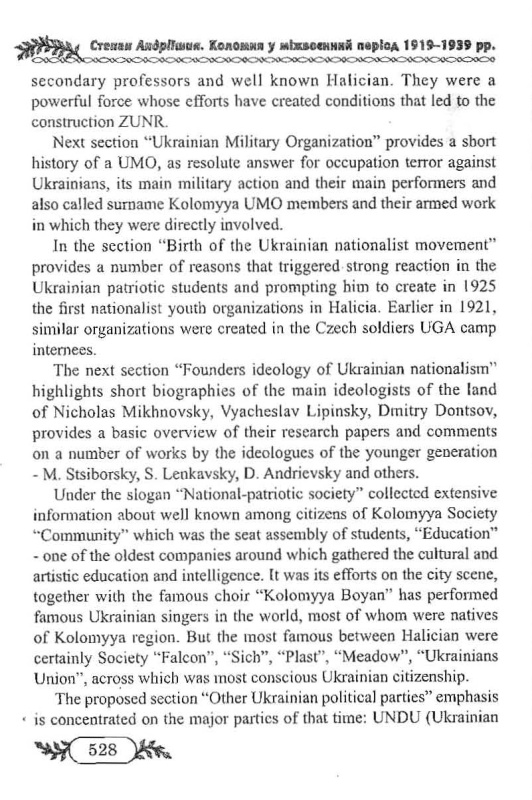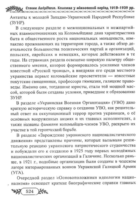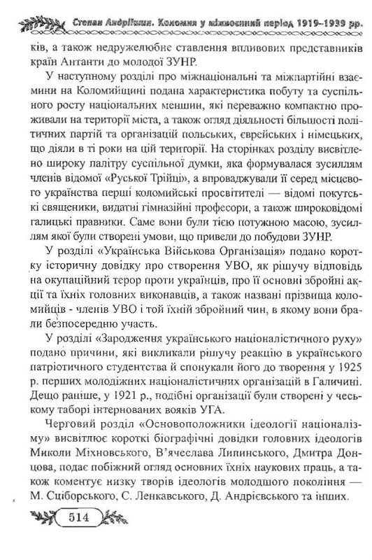 Книга Степана Андріїшина відноситься до жанру історичного краєзнавчого дослідження, яке заглиблює читача у світ безкомпромісної політичної боротьби за національне визволення і створення Української держави. У своєму новому дослідженні автор аналізує основні етапи українського патріотичного руху в Східній Галичині, зокрема в Коломиї, у міжвоєнний період 1919-1939 рр. На тлі суспільно-політичного розвитку він згадує понад тисячу прізвищ добре відомих знакових постатей Західної України. Це знані коломийські професори, видатні громадсько-політичні діячі краю, незламні борці за незалежність країни. У дослідженні автор аналізує причини втрати Західно-Української держави, міжнаціональні та між партійні взаємини на Коломийщині. Окремий розділ відводиться висвітленню діяльності Української Військової Організації. Далі читач знайде розповідь про зародження українського націоналістичного руху, про основоположників ідеології націоналізму. Діяльність національно-патріотичних товариств, інших українських політичних партій, Організації Українських Націоналістів в Коломиї висвітлена автором на основі архівних матеріалів, публікацій інших авторів та розповідей учасників подій. Видання багато ілюстроване фотографіями, які в основному публікуються вперше.