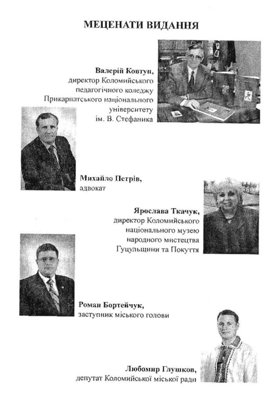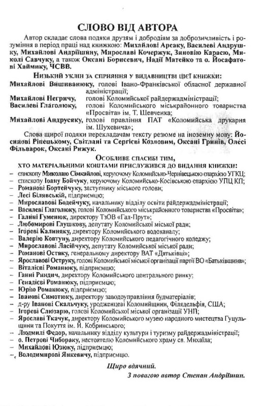 Степан Андріїшин розпочав свій виступ з подяк голові Івано-Франківської обласної державної адміністрації Михайлові Вишиванюку, голові Коломийської райдержадміністрації Михайлові Негричу, Коломийському міському голові Ігорю Слюзарю, друзям та добродіям за доброзичливість і розуміння в період праці над книжкою, а саме: Михайлові Арсаку, Василеві Андрушку, Михайлові Андріїшину, Мирославі Кочержук, Зиновію Карасю, Миколі Савчуку, Оксані Борисевич, Надії Матейко та о.Йосафату Хаймику ( ЧСВВ). Подяка лунала перекладачам тексту резюме іноземною мовою: Йосипові Ріпецькому, Світлані та Сергію Козловим, Оксані Гринів, Олесі Фільварок та Оксані Рижук. Подяки меценатам видання та усім хто причинився до появи книжки автор виклав на її сторінках.