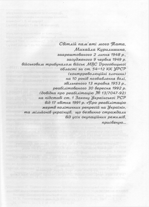 Примітним є те, що автор присвятив своє дослідження світлій пам’яті свого тата, Михайла Курилишина, якого було заарештовано та засуджено на 10 років позбавлення волі за українську патріотичну діяльність та мільйонам українців, що безвинно страждали від усіх окупаційних режимів.