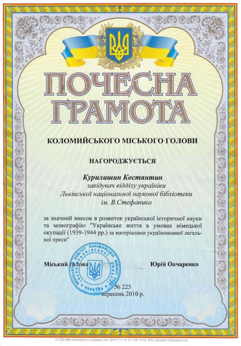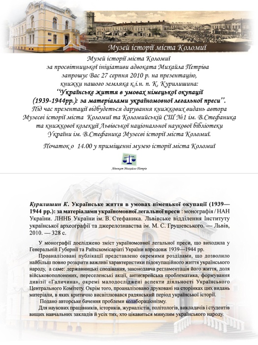 27 серпня 2010 р. в приміщенні Музею історії міста Коломиї за просвітницької ініціативи адвоката Михайла Петріва відбулася перша публічна презентація книжки нашого краянина - кандидата історичних наук, завідувача відділу україніки Львівської національної наукової бібліотеки ім. В.Стефаника Костянтина Курилишина "Українське життя в умовах німецької окупації (1939-1944 рр.): за матеріалами легальної україномовної преси", що стало пам’ятною подією не тільки в житті міста Коломиї, а сміливо можемо сказати що, і всієї України.