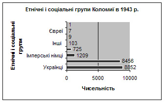 За німецької окупації відновили ґміни, повіти, округи. Утворено Коломийську округу, межі якої були значно більшими за колишній однойменний район. Від 1 серпня 1941 р. Коломию оголосили окружним центром дистрикту Галичина. Наведена діаграма [7, арк. 42, 43] показує зміни в чисельності етнічних і соціальних груп вже за два роки – у 1943 р.